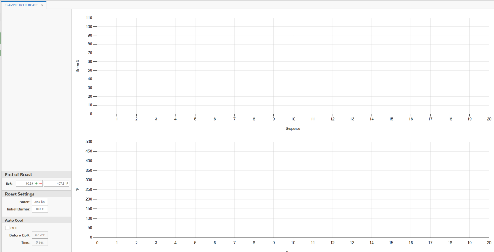 A Burner Recipe is generated by a Loring Roaster when operating in Manual operation mode, and each burner setting modification during a roast will be saved with its corresponding trigger temperature. When a Burner Recipe is saved from a manual roast, the file also contains a Roast Profile recorded from the bean temperatures during the roast. Modifying the Burner Recipe does not alter its associated Roast Profile, and vice versa.