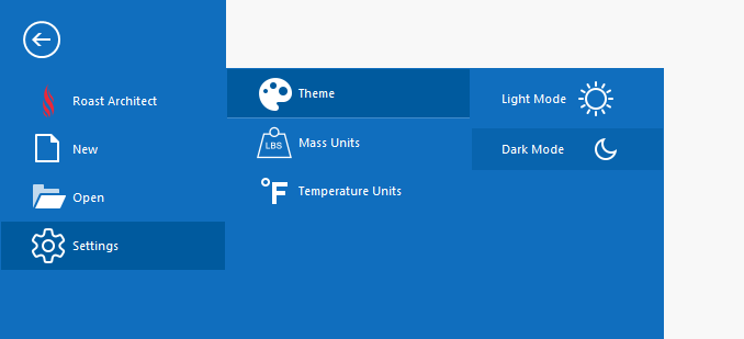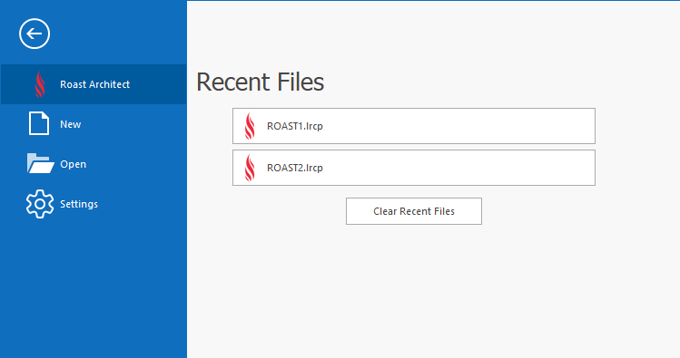 The File Menu is the backstage and starting view of Roast Architect. From the backstage you are able to open Roast Architect files, adjust the program settings, access user account settings, or access this help guide. The Back Arrow Button will take you back to the Home screen.