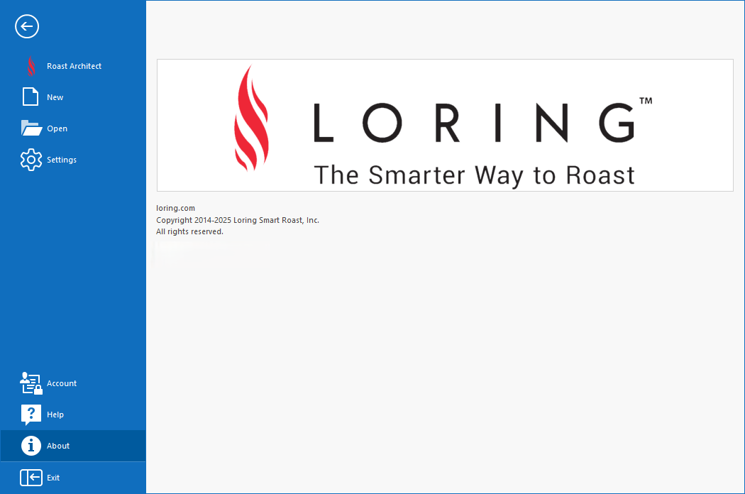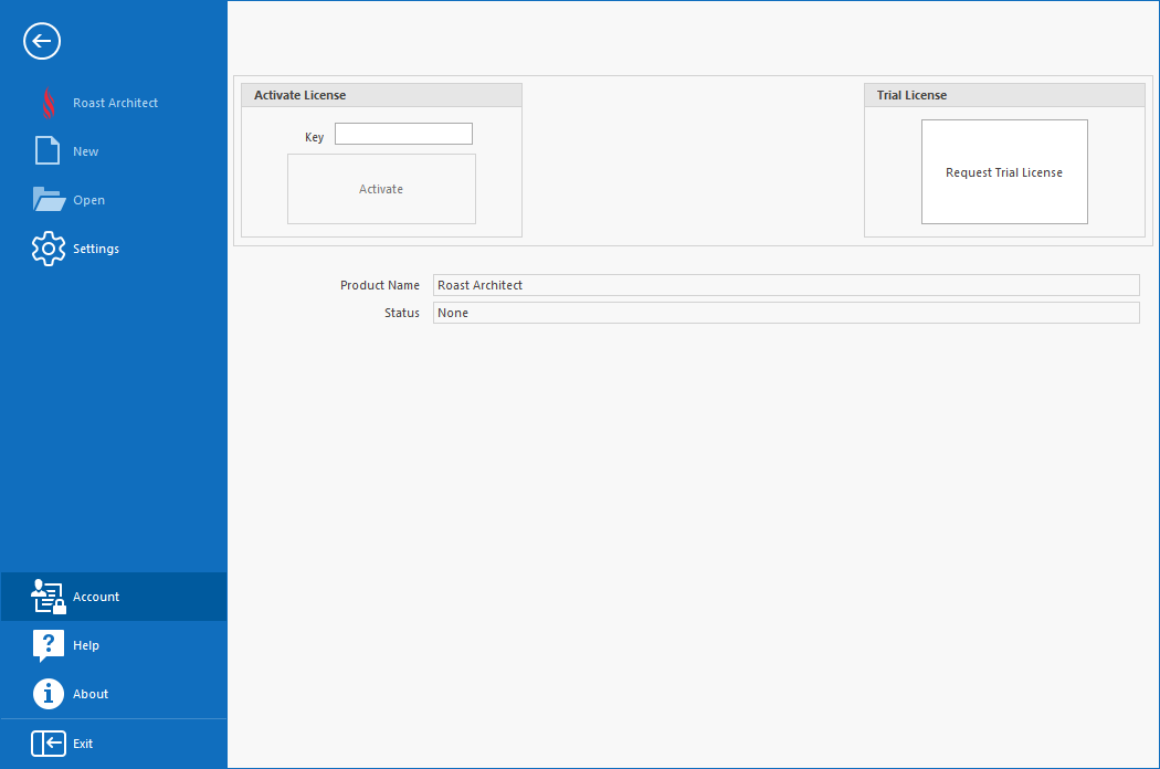 The Account screen allows for the activation of Roast Architect via a Trial License, or via entering the Key for a purchased Roast Architect license. When activated, this screen will show additional information regarding the status of the license.