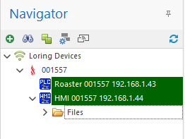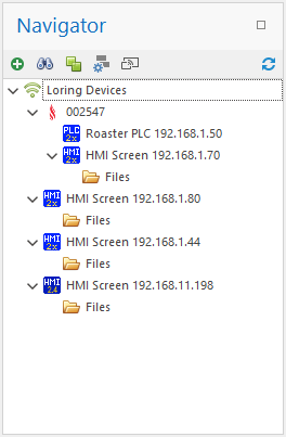 The Navigator Tool Bar assists in adding and organizing Loring Roaster devices, such as Loring PLCs and HMI screens.