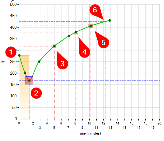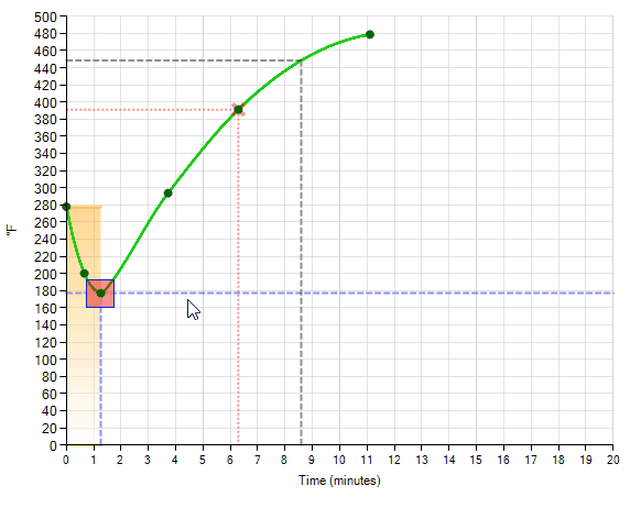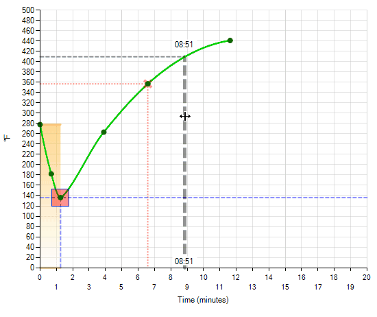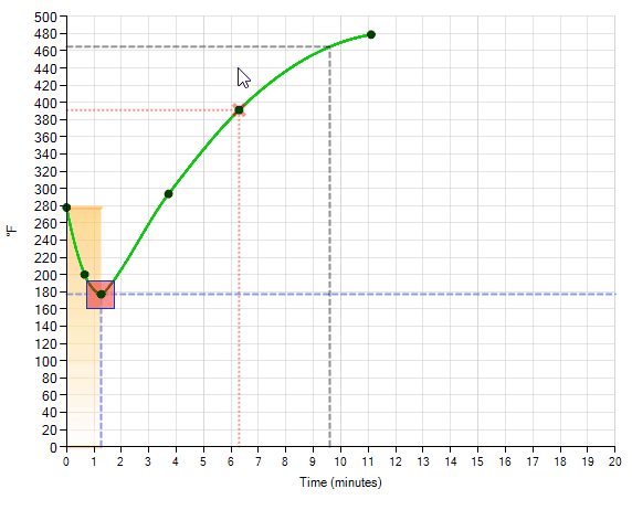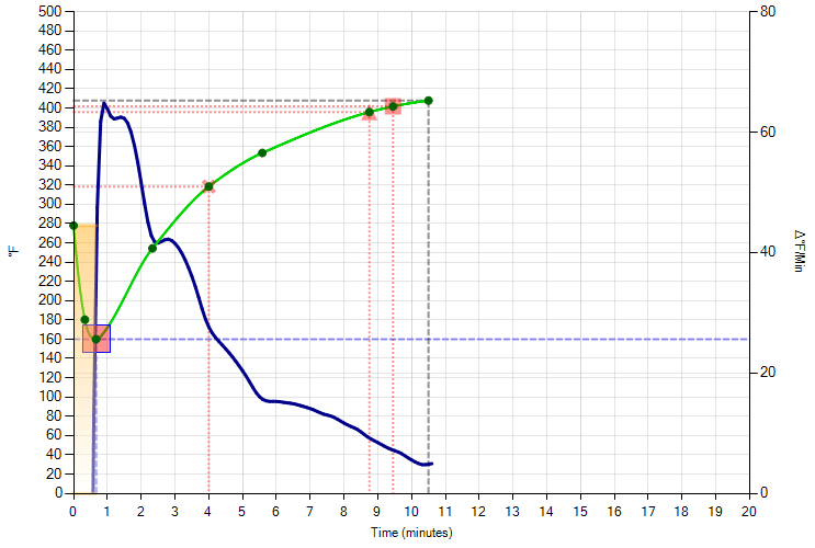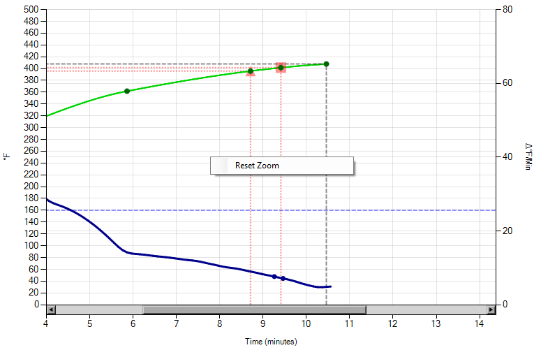 Hovering the mouse over the Rate of Rise curve will highlight the temperature point and show it for a brief moment for review.