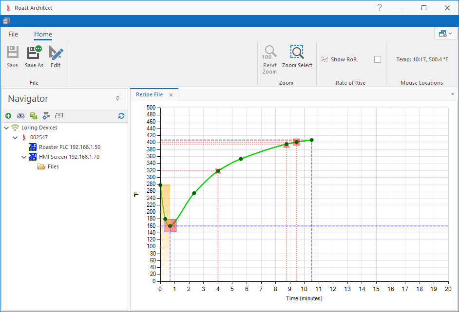 The Editing Tools appear differently according to which Edit mode you are using- Roast Profile or Burner Recipe. You may switch between the two Edit modes on the same Profile, and the saved file will retain changes from both Edit modes. However, the two Edit modes do not interact or affect one another. Note that if a completed Manual Roast is saved from a Loring Roaster, it will contain both a Roast Profile and a Burner Recipe in one Profile file.
