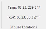 Displays the location of the mouse on the graph. The coordinates will display the according temperature and the rate of rise at the mouse location. This does NOT display the highlighted temperature point on either the Bean Temperature or Rate-of-Rise curves.