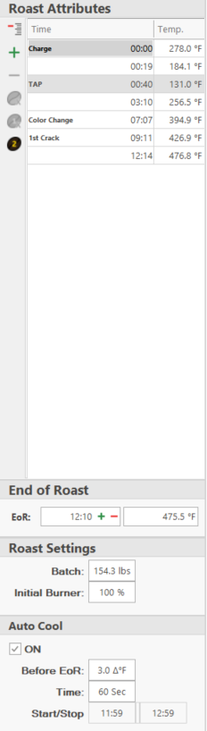 The End of Roast temperature is not optional. It can be changed by entering a time or temperature value in the EoR section of the Roast Attributes window. When one parameter is entered, the other parameter will be automatically calculated according to the Profile. The EoR point can additionally be changed by holding either of the leaders with the mouse and dragging the leaders to the desired point of the Bean Temperature Profile on the chart.