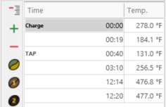 The Anchor Points table allows for the direct editing of Anchor Points. The time and temperature values can be input with a numerical keypad (MM:ss time formatting is required). The time can be incremented and decremented from the table entry. Dragging the Anchor Points using the graph will also modify the values in the Anchor Points table.